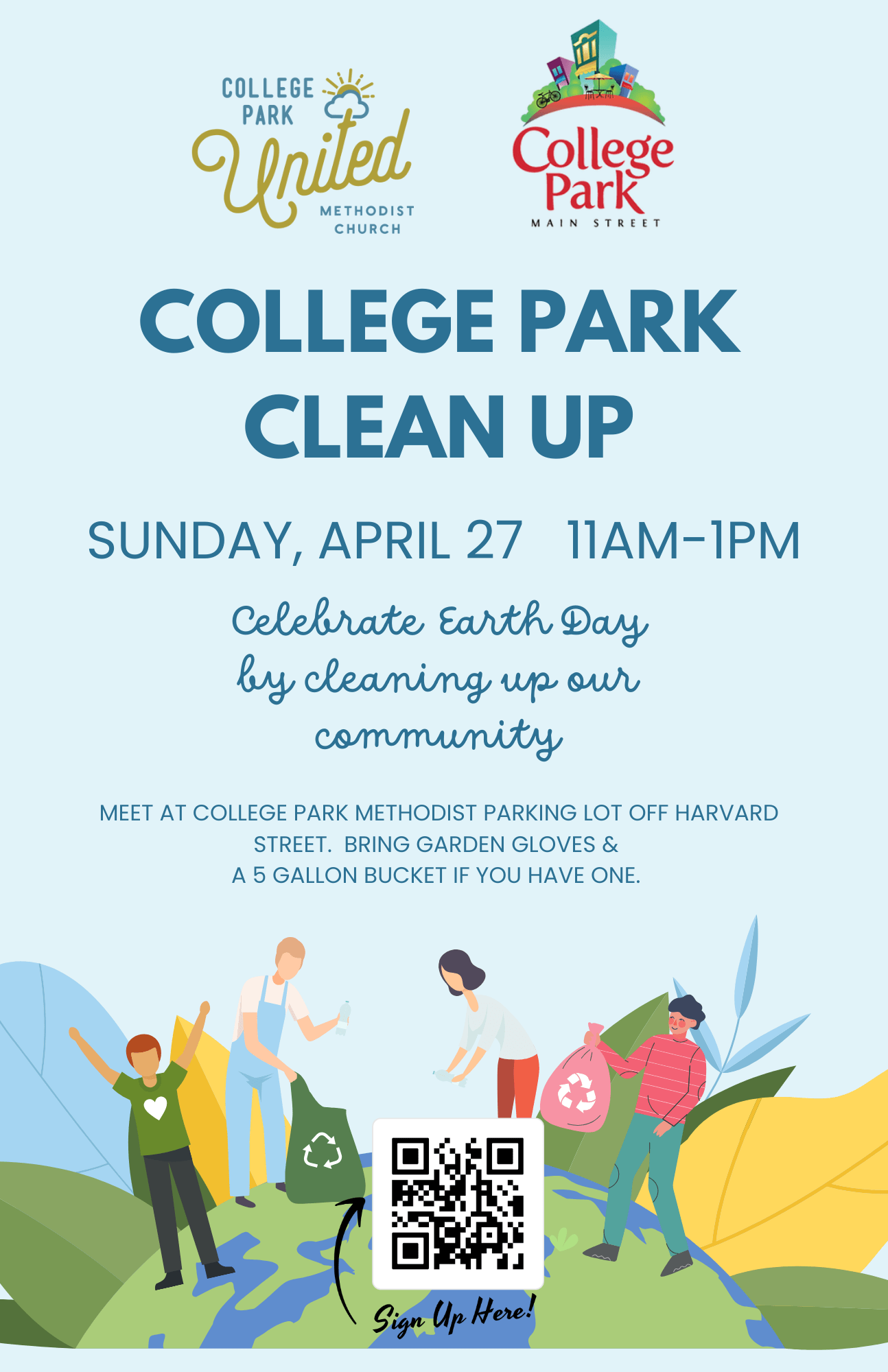 Please join us to clean up the college park area in honor of EARTH DAY. Volunteers: College Park CLEAN UP